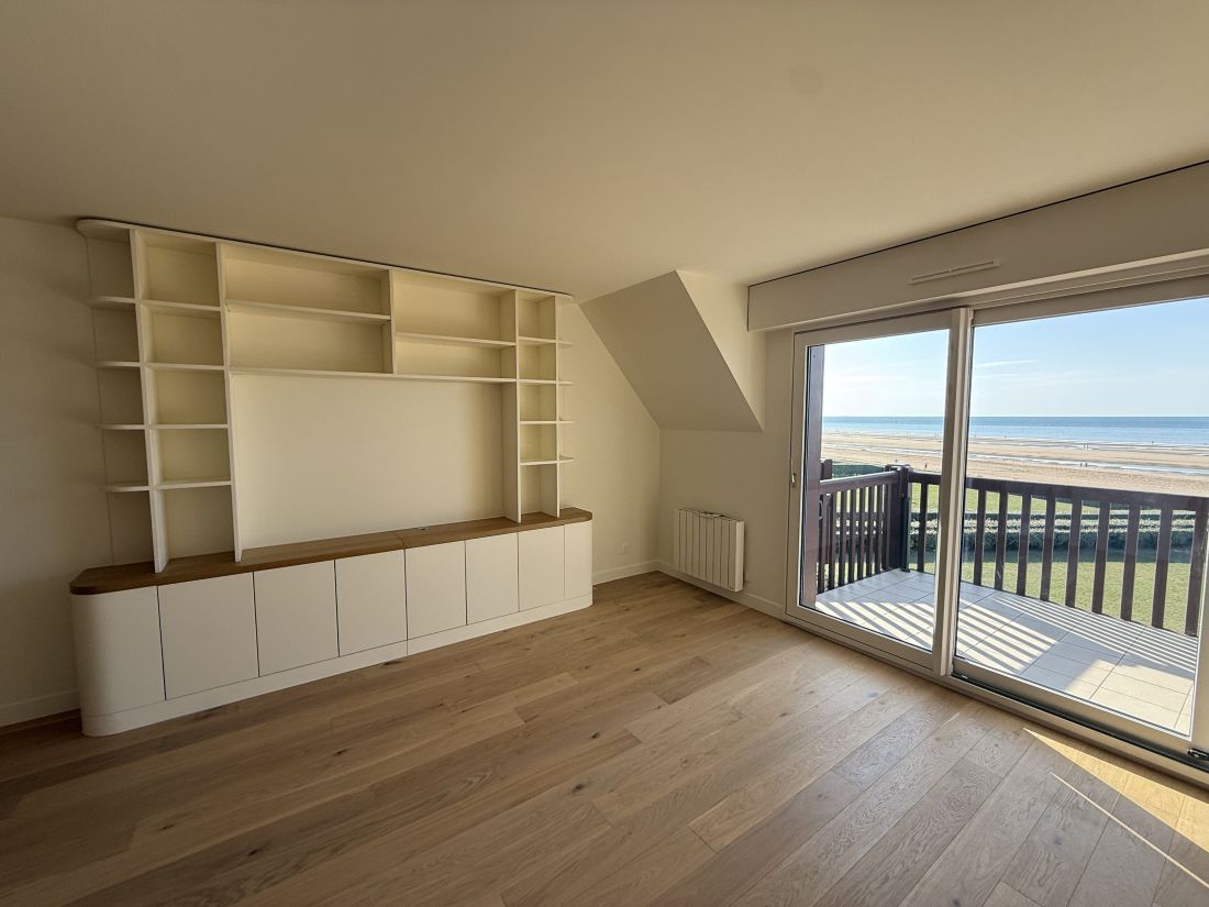 Situé dans la résidence de standing "Royal Cup" à Bénerville sur Mer, cet appartement de 102,66 m² (114,49 m² au sol) offre une exposition Sud-Ouest et une vue imprenable sur la mer. Il comprend un séjour lumineux de 40,24 m² avec cuisine américaine, trois chambres dont une avec terrasse, deux salles de bain et une salle d'eau.